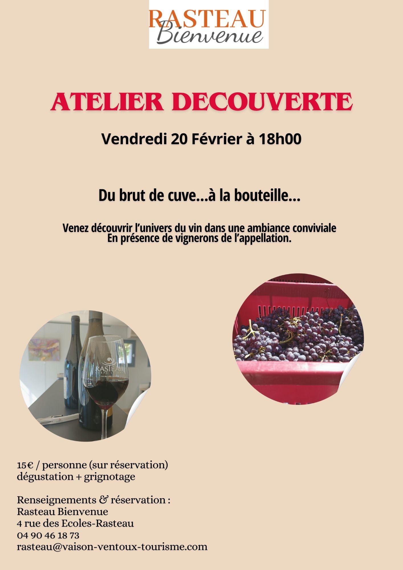 ATELIER DECOUVERTE Rasteau Bienvenue vous propose son premier atelier de l'année. "Du brut de Cuve à La bouteille"; |